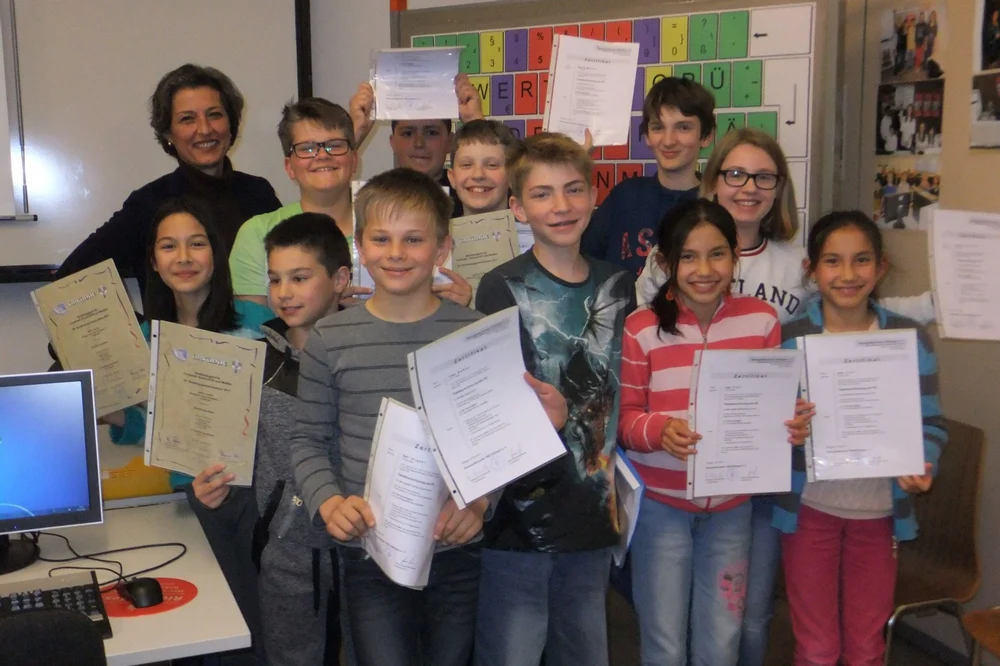 Die Klasse von Heidi Bauer freut sich über ihre Zertifikate und die erreichten Ziele.